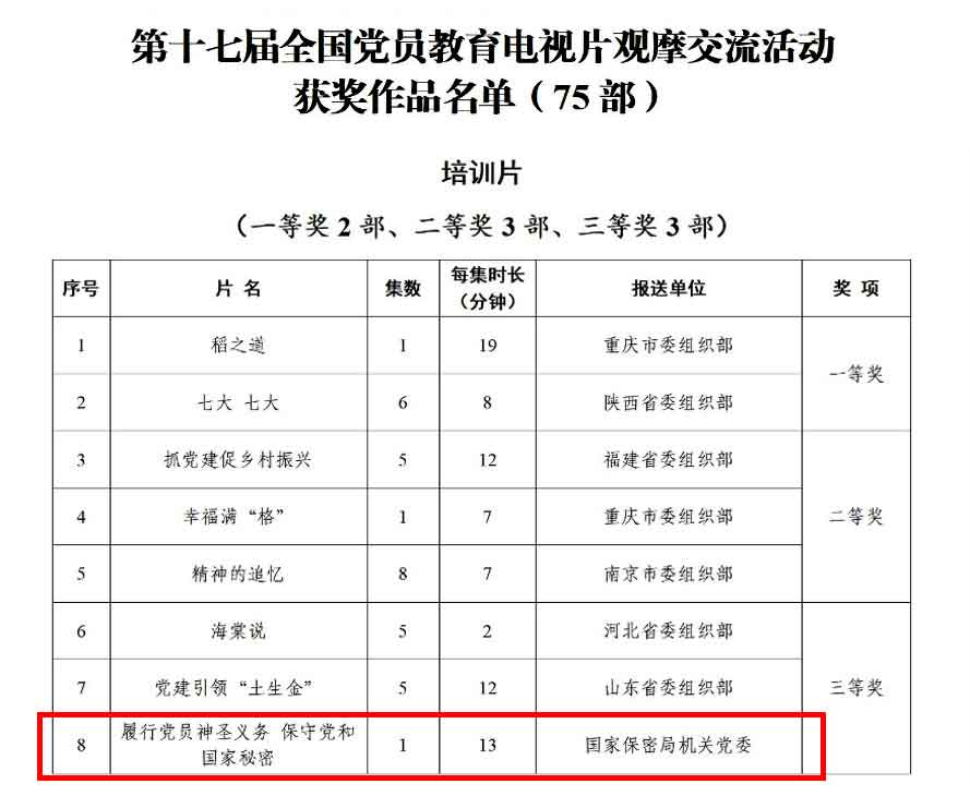 近期,由保密辦(局)機關黨委指導和報送、金城出版社黨總支組織創作的《履行黨員神圣義務 保守黨和國家秘密》培訓片從各地區、各部門、各單位選送的1293部作品中脫穎而出,榮獲第十七屆全國黨員教育電視片觀摩交流活動培訓片類三等獎,是該類獎項獲獎單位中唯一的中央和國家機關部門。